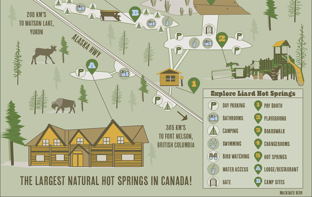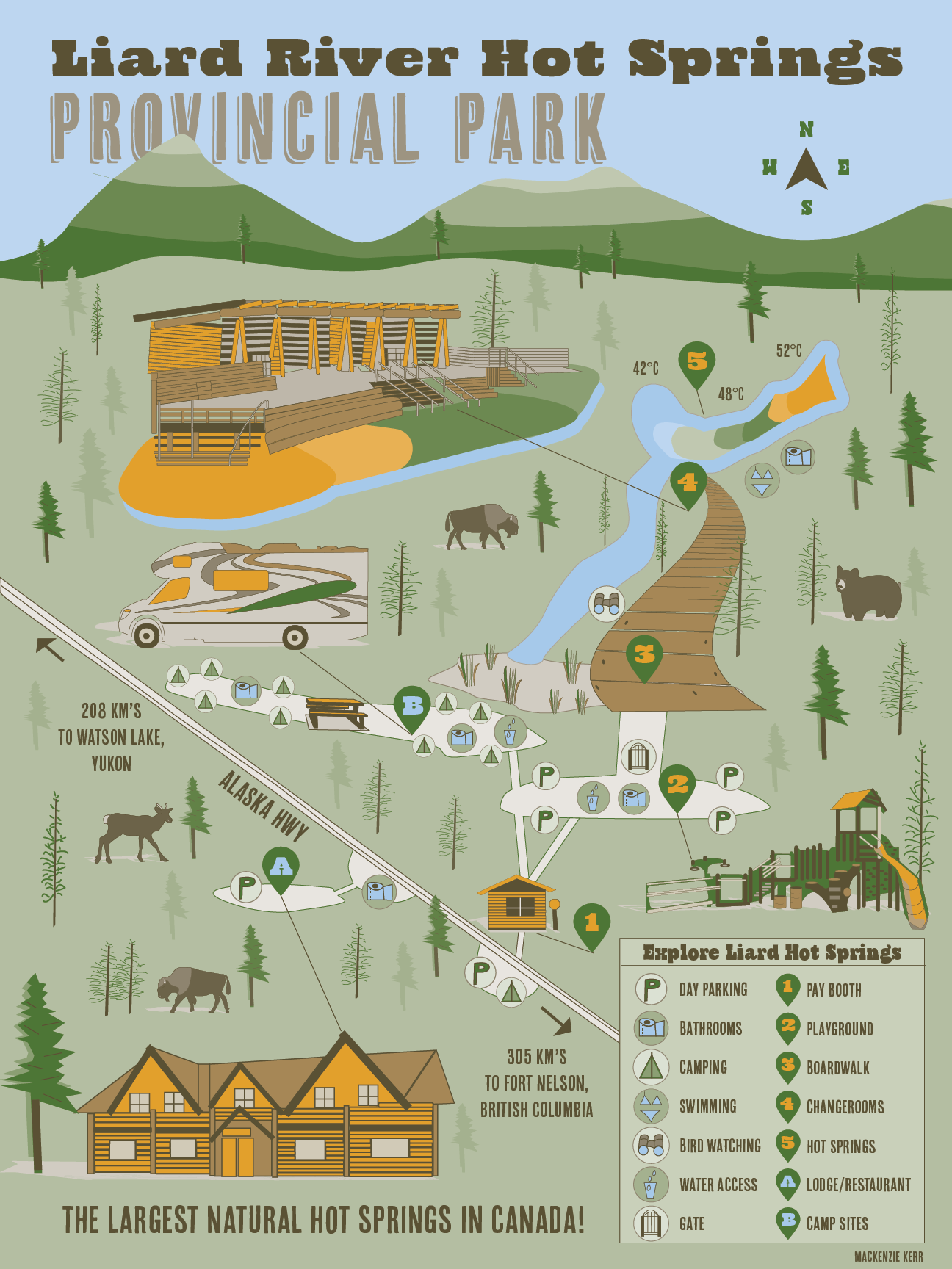 One of my favourite projects in the course, this illustrated map allowed me full creative freedom and extensive use of Illustrator for over 30+ hours. I designed a keepsake map for Liard Hot Springs, drawing from personal experience to create a detailed, to-scale layout with cohesive illustrations and a limited six-colour palette. The map balances accuracy and charm, making it ideal for tourist attractions, music festivals, weddings, neighbourhoods, large properties, or museums.